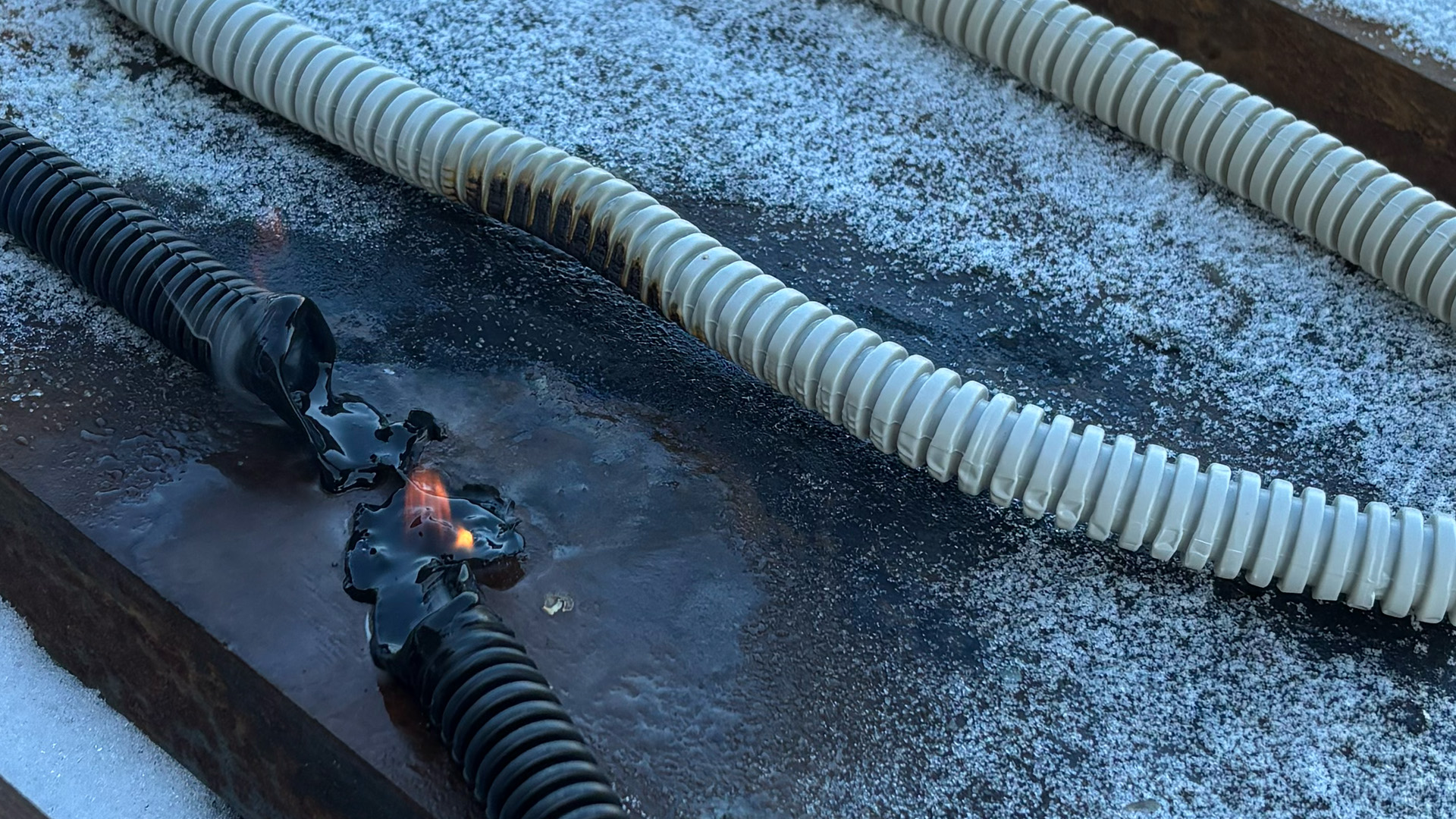 В нашем недавнем эксперименте мы наглядно показали, как ведут себя в огне обычные гофротрубы. Напомним результат: