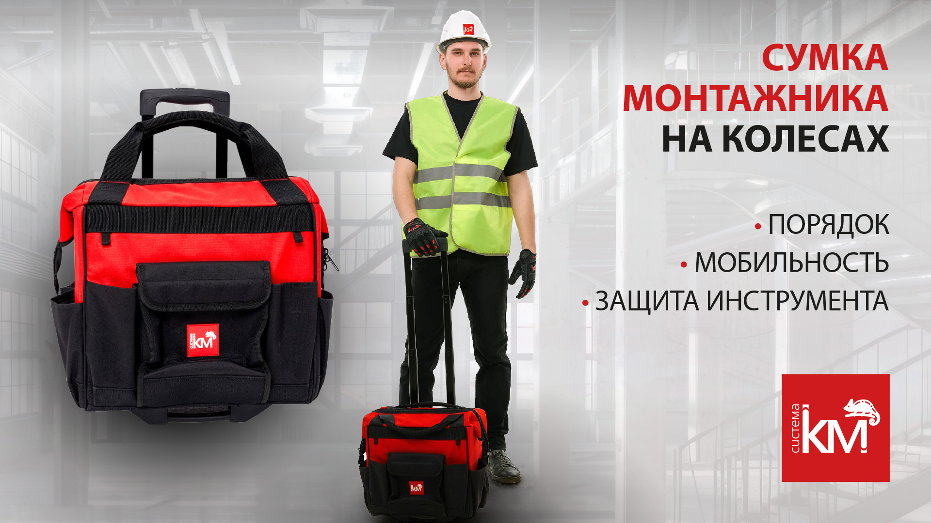 Использование профессиональной сумки-тележки от СИСТЕМА КМ повышает безопасность хранения инструмента, ускоряет доступ к нему и снижает утомляемость монтажника при перемещении тяжёлого оборудования.