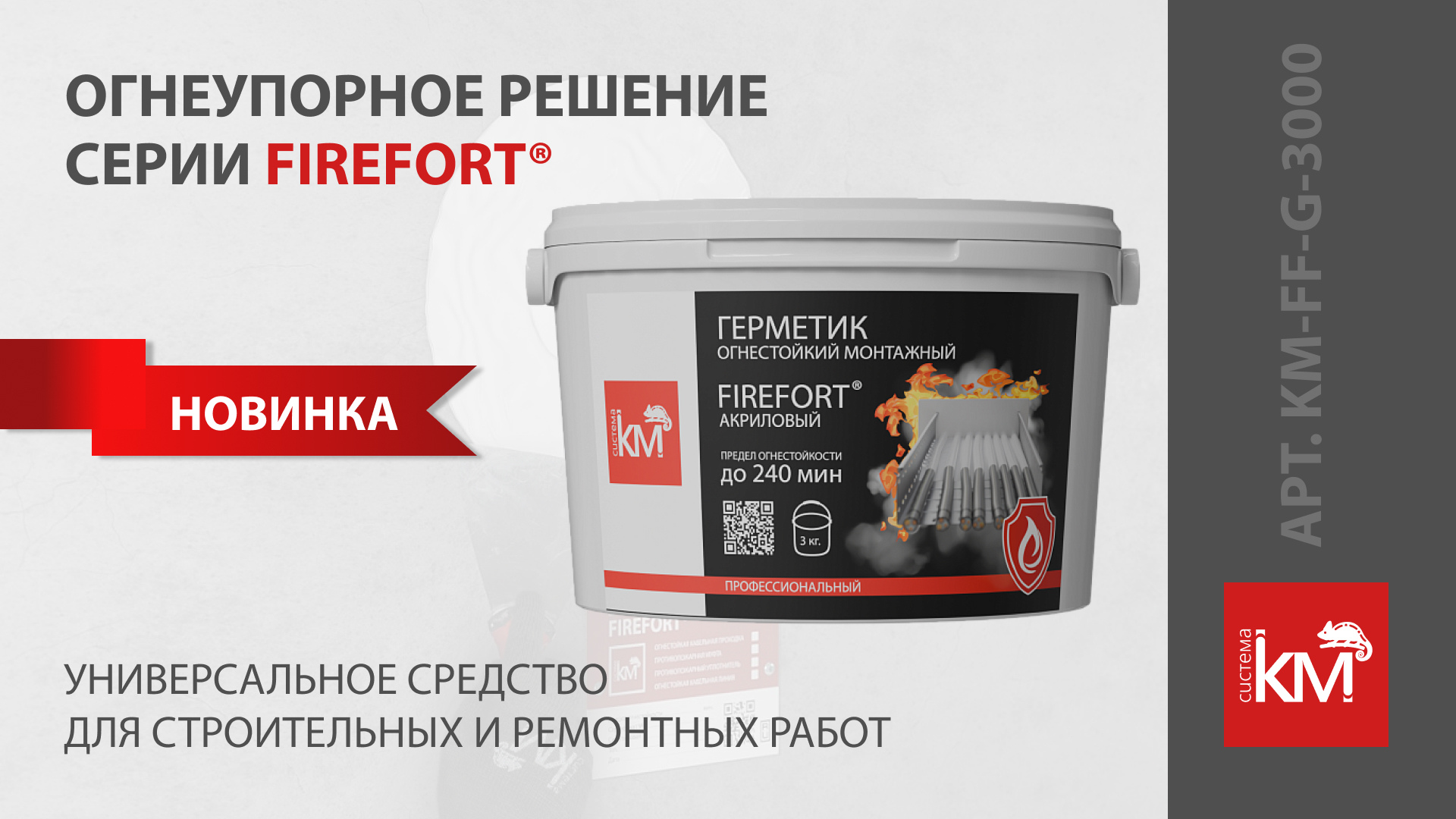 Монтажный огнестойкий герметик (арт. KM-FF-G-3000) представляет собой однокомпонентный высоковязкий акриловый состав на водной основе, предназначенный для профессионального использования. При воздействии высоких температур заделка, образованная герметиком, превращается в негорючий слой, сохраняющий свои огнестойкие свойства до 240 минут.